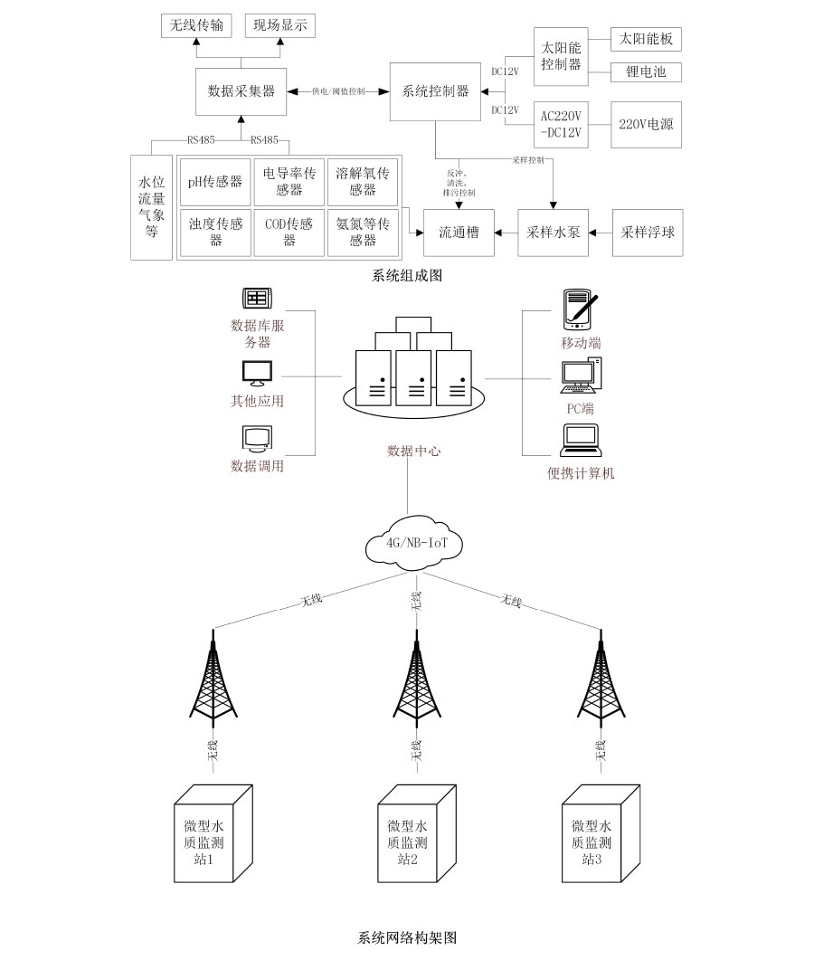 固定式微型水質自動監測站由前端采樣單元、水質傳感器監測單元、數據采集控制單元、數據傳輸單元,后端數據接收服務、環境監測控制平臺及數據處理分析應用功能組成。系統構架圖如下: