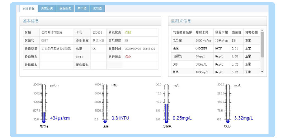 環(huán)境監(jiān)測(cè)云平臺(tái)可查看通訊卡卡號(hào)、儀器與平臺(tái)的通訊狀態(tài)、信號(hào)強(qiáng)度、儀器電量等功能