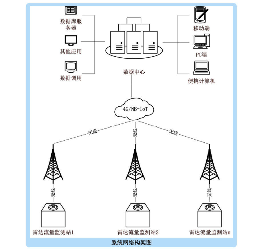 雷達(dá)式流量監(jiān)測(cè)系統(tǒng)由下至上分為數(shù)據(jù)采集單元、數(shù)據(jù)處理單元、數(shù)據(jù)傳輸單元和監(jiān)控中心數(shù)據(jù)服務(wù)平臺(tái)組成。由雷達(dá)流量計(jì)測(cè)量流體的流速、水位等數(shù)據(jù),結(jié)合斷面參數(shù)計(jì)算出斷面流量;遙測(cè)終端機(jī)(RTU)將數(shù)據(jù)通過(guò)GPRS/4G/NB-IoT無(wú)線(xiàn)網(wǎng)絡(luò)通訊技術(shù)傳輸至流量監(jiān)測(cè)中心,監(jiān)測(cè)中心可實(shí)時(shí)對(duì)現(xiàn)場(chǎng)數(shù)據(jù)可視化監(jiān)測(cè),實(shí)現(xiàn)系統(tǒng)運(yùn)行無(wú)人值守、有人管理的模式。如下圖: