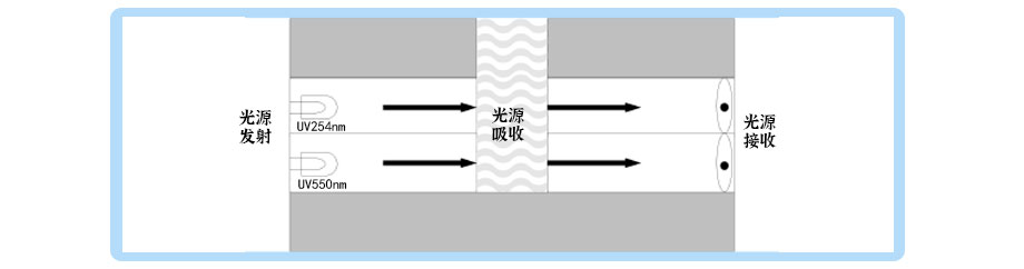 AN-WQSCOD型COD傳感器雙光路測量原理:含有共軛雙鍵或多環(huán)芳烴的有機(jī)物溶解在水中時(shí),對(duì)紫外光有吸收作用。因此,通過測量這些有機(jī)物對(duì)254nm紫外光的吸收程度,以特別吸光系數(shù)SAC254來表達(dá)測量結(jié)果,作為衡量水中有機(jī)污染物總量的物理量。同時(shí)由于水中濁度對(duì)254nm紫外光有吸收作用進(jìn)而影響測量結(jié)果,故采樣對(duì)有機(jī)物無吸收但對(duì)濁度有的550nm光進(jìn)行補(bǔ)償消除濁度影響。