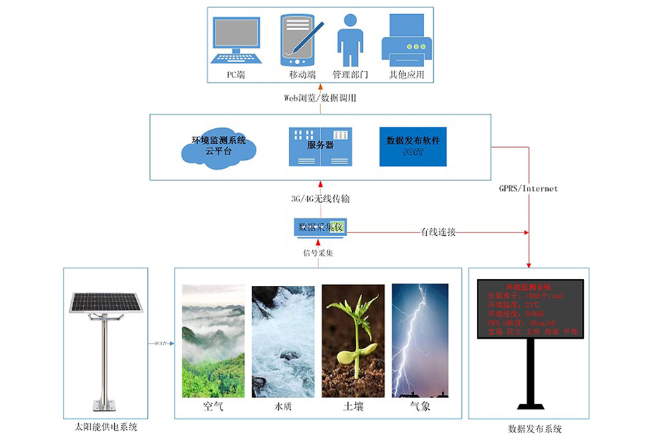 農業環境在線監測系統在線監測站將監測到的水質、氣象、土壤等數據,通過GPRS、Internet等傳輸方式,將數據傳輸到接收數據的服務器上,并且自動將數據保存并寫入數據庫,客戶端可以通過瀏覽器查看數據等。用戶可以通過接收軟件和短信控制的方式監控監測儀設備。數據進入數據庫后可將數據發布到LED顯示大屏上。以下是系統傳輸示意圖: