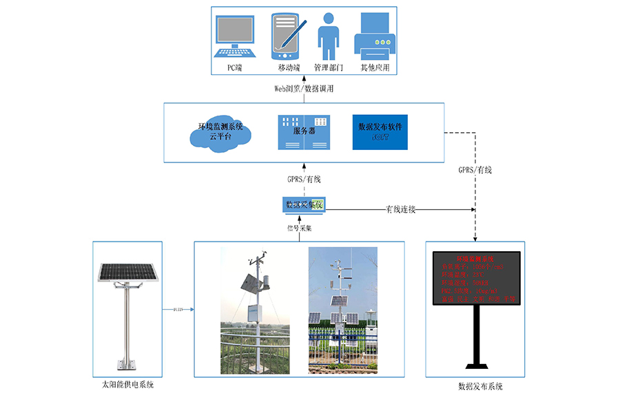 在線氣象環境監測系統是主要針對區用戶的一種實用型的自動監測系統,它是將農業、林業、景區等場所的風速、風向、雨量、空氣溫度、空氣濕度、光照強度等環境質量參數,通過自動監測設備實時監測,將監測數據通過GPRS等方式傳輸到網絡監控軟件平臺、LED顯示屏、PC端、手機APP等,直觀、快捷的展現給用戶,并為各功能平臺提供統一服務入口,實現數據監測系統信息的發布和查詢。氣象監測系統由氣象傳感器、氣象數據采集儀、電源系統、全天候防護箱、LED顯示屏、環境監測云平臺等部分構成。可對風速、風向、雨量、空氣溫度、空氣濕度、光照強度等氣象要素進行全天候現場監測。