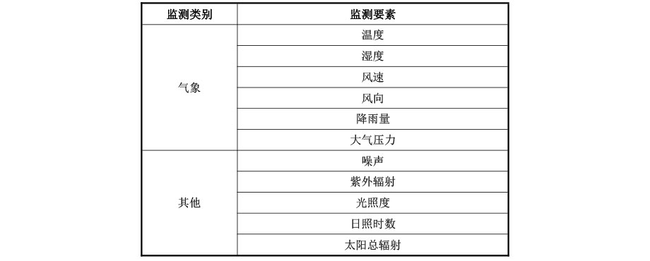 系統將建設在線氣象環境監測系統,在線氣象環境監測系統收集處理與應用分析平臺以及配套的網絡體系和軟硬件設施。具體設備類型和設備數量根據實際情況和業務需求可靈活配置,監測項目如下表所示。